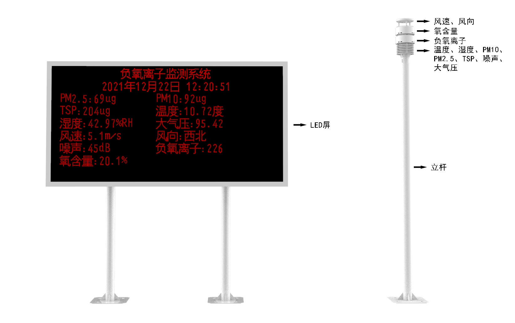 1、集成度高,方案靈活:系統可集成負氧離子、空氣溫度、空氣濕度、PM2.5、PM10、大氣壓力、氧含量、噪聲、風速、風向
